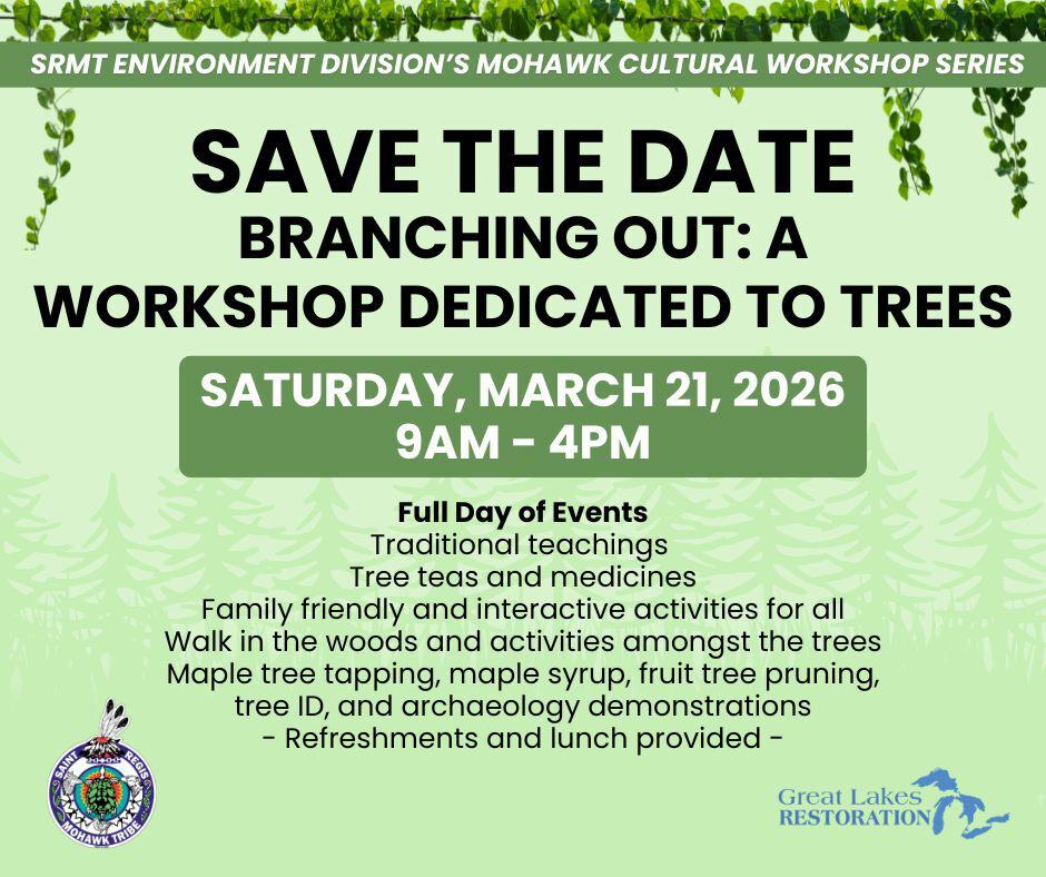 The SRMT Environment Division’s Mohawk Cultural Workshop Series wants you to save the date for Branching Out: A Workshop Dedicated to Trees. This workshop will be held on Saturday, March 21st, from 9AM - 4PM. Family friendly and interactive activities for all including Apple Tree Pruning, Traditional Teachings, Tree Teas and Medicines and even Maple Tree Tapping!